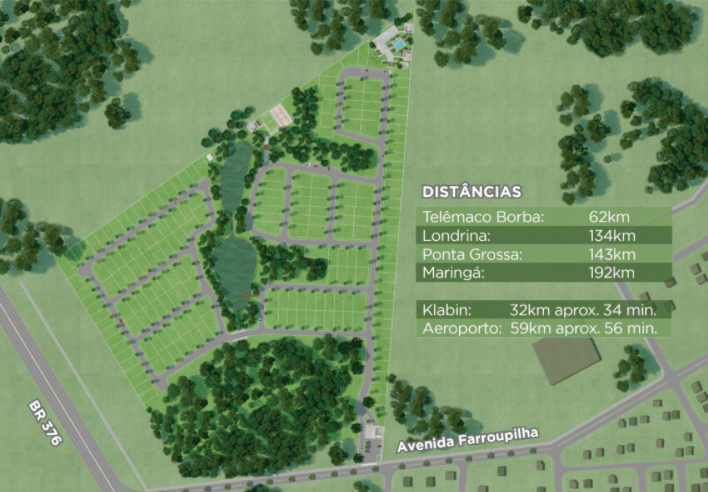 Os terrenos são bem distribuídos, com vias amplas e calçadas generosas. A infraestrutura completa inclui iluminação, água potável, rede de esgoto e galerias de água pluviais.